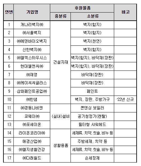 이들 기업들은 사회취약계층의 실내환경 개선을 위해 건축자재(벽지, 친환경페인트 등), 주방가구, 공기청정기, 아토피환자를 위한 피부보습제 등을 후원한다.