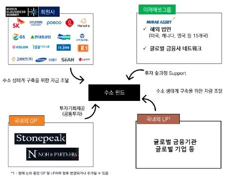 수소 펀드는 민간 기업들이 수소분야에 대한 대규모 투자의 필요성에 대해 공감하여 자발적으로 조성을 추진하였고,국내 기업(코리아 H2 비즈니스 서밋 회원사 등)과 외부 투자자의 출자 등을 통해 5,000억원 규모를 목표로 결성하여, 10년간 운용 후 청산할 예정이다.