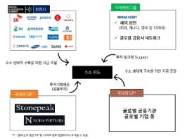 모펀드 운용사인 미래에셋이 공동 투자 파트너 스톤피크(Stonepeak), 자펀드 운용사인 노앤파트너스(Noh·Partners)와 함께 금년 말까지 투자자를 모집하고 자금을 매칭하여, 내년 초부터 수소 분야에 본격 투자할 예정이다.