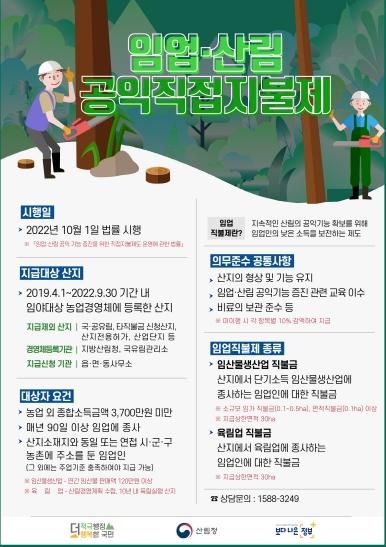 주요원 임업직불제긴급대응반 과장은 "임업 직불금 혜택을 받을 수 있도록 산주와 임업인이 올해 9월 30일까지 임업경영체 등록을 꼭 해줄 것을 당부드린다”라고 말했다.
