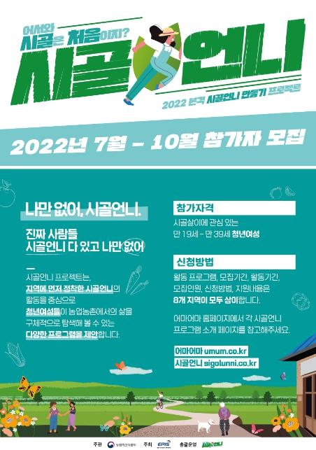 올해 새롭게 도입된 ‘시골언니프로젝트’는 농업·농촌을 접할 기회가 적은 청년 여성들을 위해 농촌지역에 대한 탐색 기회를 제공하고 향후 정착에 필요한 사회적 관계망을 구축토록 지원하는 사업이다.