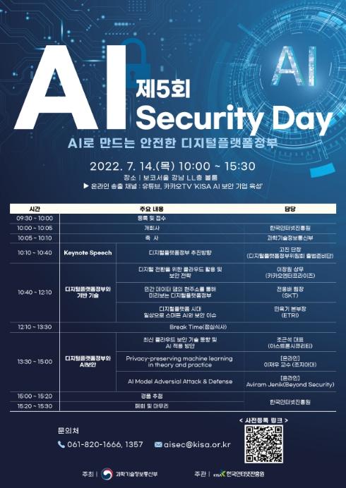 과학기술정보통신부와 한국인터넷진흥원은 인공지능(AI) 보안 산업 활성화를 위해 ‘제5회 AI Security Day 세미나’를 2022년 7월 14일(목)에 온·오프라인 동시 개최한다.