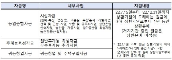 이번 조치는 올해 1월 1일 이후 원금 상환기일이 도래하여 현재 연체 중이거나, 올해 7월 15일부터 12월 31일 사이에 상환기일이 도래할 예정인 농업종합자금(시설자금), 후계농육성자금, 귀농창업자금을 대상으로 하며, 총 2,076억 원으로 추정된다.