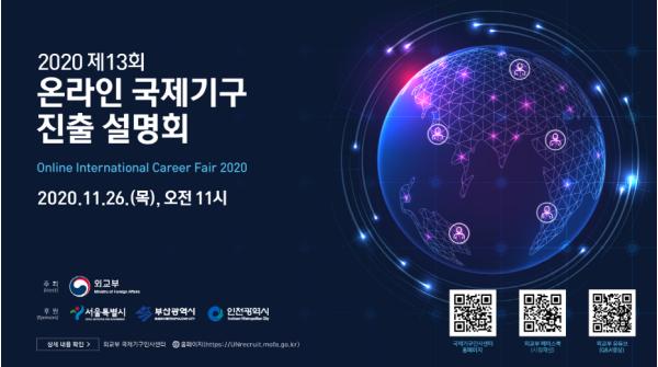 외교부는 국제기구 진출에 관심 있는 우리 국민들에게 현장감 있고 실질적인 정보를 제공하기 위해 주요 국제기구 인사담당관을 초청, 11.26일 ‘제13회 국제기구 진출 설명회’를 온라인 개최한다.