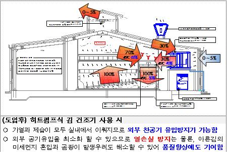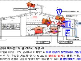 히트펌프식 김 건조설비는 물김을 마른 김으로 가공할 때 발생하는 다량의 고온다습한 수증기를 모아 수분은 제거하고 열에너지만 남겨 이를 재활용하는 설비다. 이 설비는 에너지 효율이 높아 동일한 에너지를 사용하더라도 기존의 설비보다 월 평균 1,800만 원의 경영비가 절감*될 수 있고, 중형차 400대가 연간 배출하는 약 839톤 규모의 이산화탄소 배출 저감효과도 있어 대기환경 개선에도 기여할 것으로 예상된다.