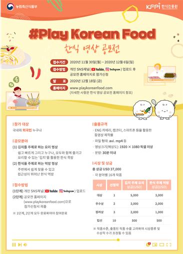 이번 공모전은 #Play Korean Food로 코로나19로 인해 외출이 어려운 요즘 다양한 언어권 사람들이 일상 속에서 한식을 즐기는 모습을 함께 나누기 위해 마련됐다.
