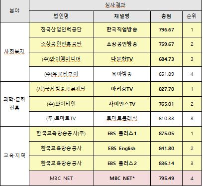 심사 결과 3개 공익성 방송분야 중 ①사회 복지 분야에는 한국직업방송, 소상공인방송, 다문화TV ②과학·문화 진흥 분야에는 아리랑TV, 사이언스TV ③교육·지역 분야에는 EBS플러스1, EBS English, EBS 플러스2, MBC NET을 각각 공익채널로 선정하였다.