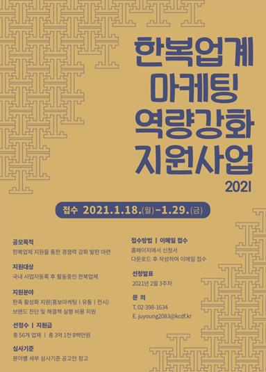 문화체육관광부는 한국공예디자인문화진흥원 한복진흥센터와 함께 12월 29일부터 1월 29일까지 2021년 한복업계 마케팅 역량 강화 지원 사업’에 참여할 한복업체를 공모한다고 밝혔다.