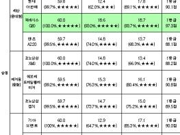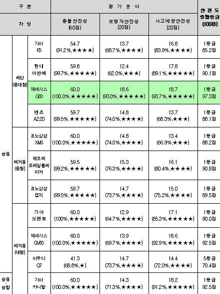 3개 안전성 분야(충돌·보행자·사고예방) 전 항목 평가결과를 합산한 종합평가에서 10차종이 1등급, 1차종은 5등급으로 평가되었다.