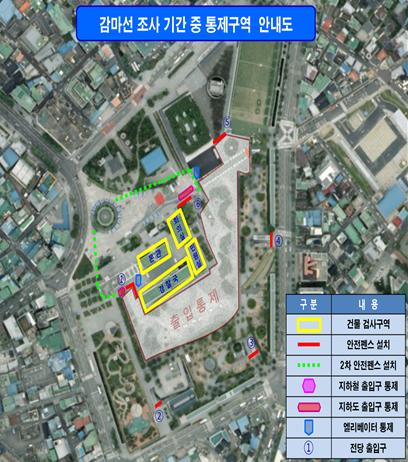 이번 조사 기간 동안 문화전당역에서 국립아시아문화전당 내 아시아문화광장으로 진입하는 출입구와 전당 에이(A)?비(B)주차장, 지상에서 전당으로 진입하는 출입구는 전면 통제한다. 옛 전남도청 일대와 민주광장 주변, 지하상가 출입로는 조사 일자에 따라 순차적으로 이용을 제한할 예정이다. 조사구역 내 안전거리를 유지하기 위해 가림막을 설치하는데, 일반인들은 가림막 안으로 들어갈 수 없다.