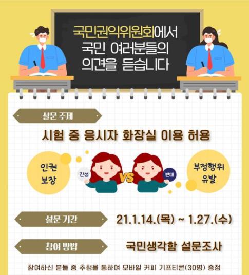 국민권익위원회는 이번 달 14일부터 27일까지 정책참여 플랫폼 ‘국민생각함’에서 ‘국가·지방자치단체 등 각종 채용·자격시험’ 도중 응시자의 화장실 이용을 허용해야하는지에 대한 국민의 의견을 듣는다고 전했다.