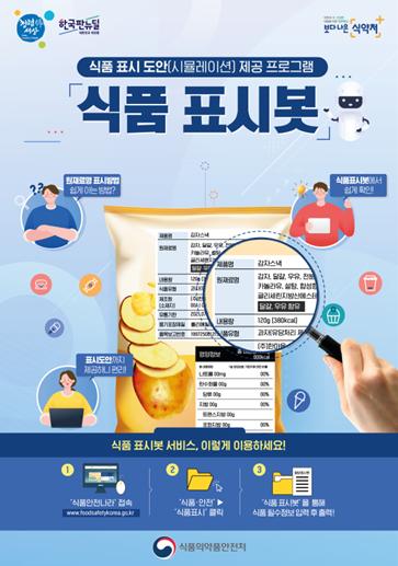 식품의약품안전처는 식품관련 영업자가 식품 표시 방법을 쉽고 편리하게 확인해 제작에 도움을 얻을 수 있도록 ‘식품 표시봇’ 프로그램을 개발하여 1월 19일부터 식품안전나라 누리집에서 제공한다고 밝혔다.