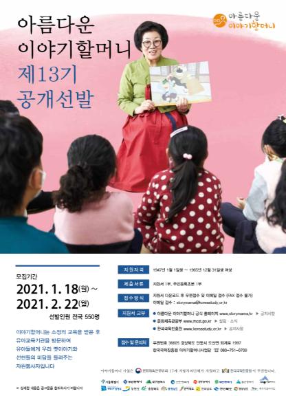 문체부와 국학진흥원은 2021년에도 '13기 아름다운 이야기할머니’를 500명 규모로 추가 선발하고, 일정 교육 기간을 거친 후 올해 10월부터 현장에 파견한다. 코로나19 확산 방지를 위해 방역 지침을 철저하게 준수하고 화상 시스템을 활용한 비대면 방식으로 안전한 환경 속에서 이야기할머니 활동을 지원할 계획이다.