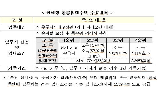 이번에 공급하는 전세형 주택은 기존 건설?매입임대주택의 입주자격을 대폭 완화해 소득?자산에 관계없이 무주택 세대 구성원이면 누구나 신청할 수 있는 것이 특징이다.
