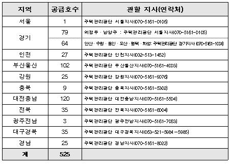 공급 대상 모두 전용면적 59㎡이하의 주택이며, 지역별로는 수도권 171호, 부산·울산·경남 127호, 대구·경북 35호, 대전·충남·충북 129호, 광주·전남·전북 38호, 강원 25호 등 총 525호를 공급한다.