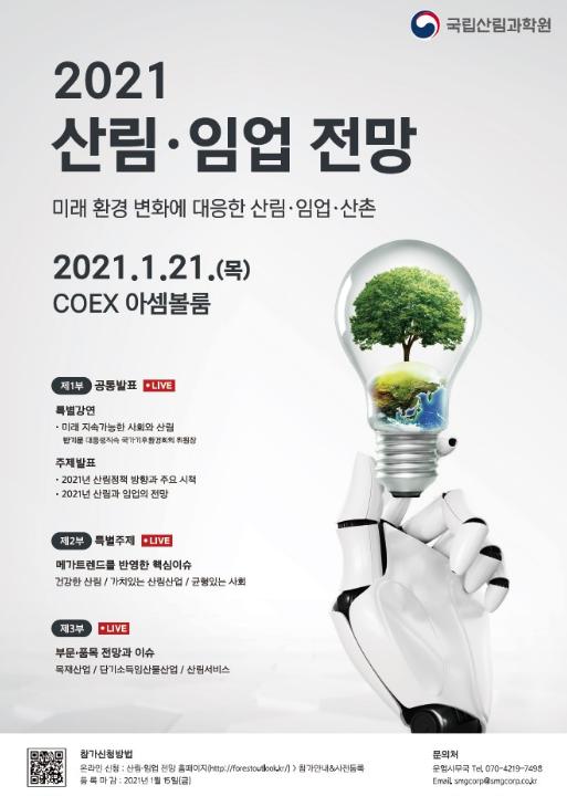 산림청 국립산림과학원은 1월 21일 「2021 산림·임업 전망발표 대회」를 온라인과 오프라인(서울 삼성동 코엑스)으로 동시 개최한다.