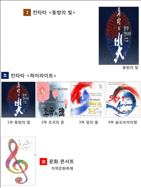 1.칸타타 동방의 빛 : 오리지널 편성: 국립합창단 혹은 지역 합창단과 오케스트라(오케스트라 65명, 합창 100명) (공연 시간 90분)