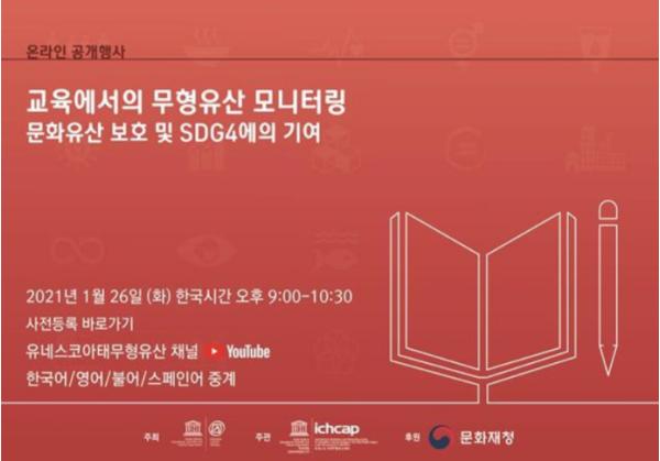 문화재청은 유네스코 아태무형유산센터가 주관하는 '교육에서의 무형유산 모니터링' 온라인 공개행사가 26일 한국시간으로 오후 9시부터 10시 30분(파리 현지시각 오후 1시부터 2시 30분)까지 약 90분간 진행된다고 밝혔다.