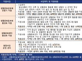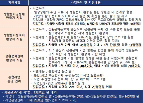 주관단체는 지역별로 ▲ 생활권 주민들 간 교류와 생활문화 활동을 통해 관계망을 형성하고 개인과 공동체 삶의 질을 높이는 ‘생활문화공동체 만들기 지원 사업’(6천만 원 내외), ▲ 생활문화동호회가 교류와 협력에 기반한 창의적인 활동을 통해 지역의 문화 주체로 성장하도록 돕는 ‘생활문화동호회 활성화 지원 사업’(4천5백만 원 내외), ▲ 생활밀착형 공간인 생활문화센터를 중심으로 지역 내 활동과 공간을 연계하는 ‘생활문화센터 활성화 지원 사업’(4천만 원 내외) 등 3개 사업과 사업운영관리(약 2천8백만 원)를 포함해 1억 7천3백만 원을 지원받을 수 있다. 이는 기존 전체 생활문화 사업의 약 50% 규모를 통합 지원하는 것이며, 향후 사업성과를 바탕으로 지원 대상 지역과 예산을 계속 확대해나갈 계획이다.