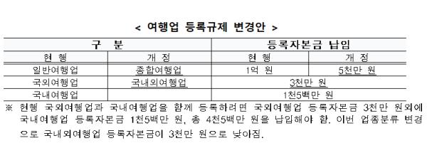 ※ 현행 국외여행업과 국내여행업을 함께 등록하려면 국외여행업 등록자본금 3천만 원외에 국내여행업 등록자본금 1천5백만 원, 총 4천5백만 원을 납입해야 함. 이번 업종분류 변경으로 국내외여행업 등록자본금이 3천만 원으로 낮아짐.