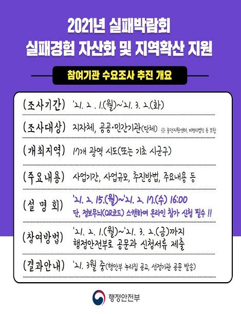 행정안전부는 「2021 실패박람회」일환으로 실패 경험을 사회적 자산화하고, 재도전 지지와 격려 분위기를 지역으로 확산하는데 함께 할 참여기관 수요조사를 실시한다고 밝혔다.