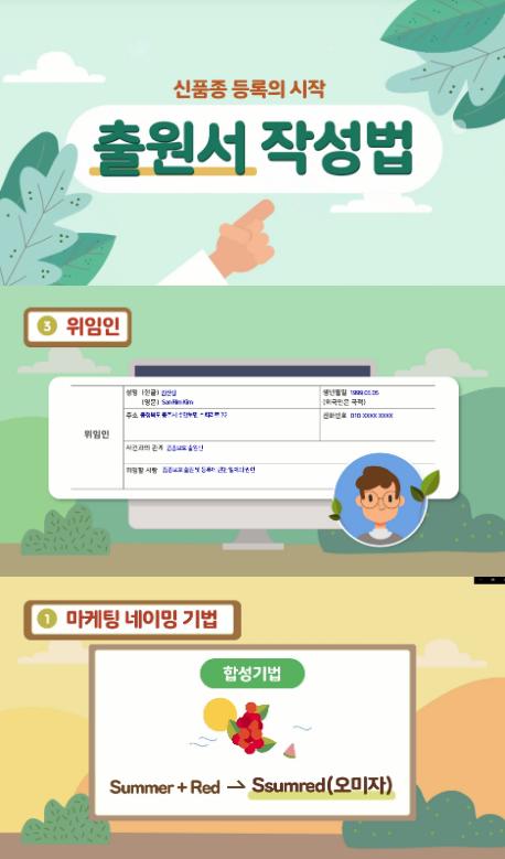 제공될 영상 콘텐츠는 ‘품종보호 출원서 작성법’, ‘위임장 작성법’으로, 해당 서류를 작성하는 과정을 ‘정보 그림(인포그래픽)’ 형태로 상세히 설명하고 있다. 아울러, 상품성을 높이기 위한 ‘품종명칭’을 쉽고 빠르게 지을 수 있도록 ‘신품종 이름 짓는 방법’도 다양한 기법을 예를 들어 안내하고 있다.