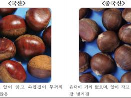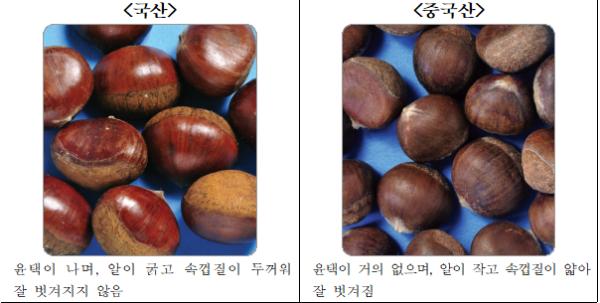 ?② [밤] 국산은 알이 굵고 윤택이 많이 나면서 속껍질이 두꺼워 잘 벗겨지지 않으나, 중국산은 알이 작고 윤택이 거의 없으며,? 속껍질이 얇아 잘 벗겨지는 것이 특징이다.