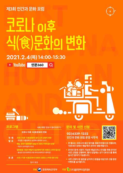 문화체육관광부는 한국출판문화산업진흥원과 함께 2월 4일 오후 2시, ‘코로나19 이후 식(食)문화의 변화’를 주제로 세 번째 ‘인간과 문화 포럼’을 개최한다.