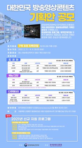 문화체육관광부는 한국콘텐츠진흥원과 함께 2월 17일부터 4월 9일까지 ‘2021 대한민국 방송영상콘텐츠 기획안’을 공모한다고 밝혔다.
