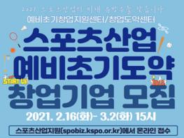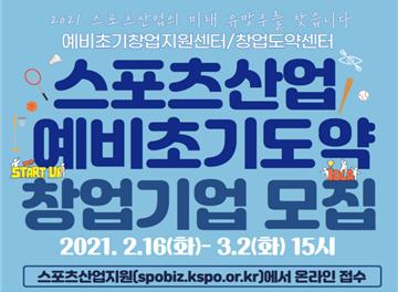 문화체육관광부는 국민체육진흥공단과 함께 스포츠산업의 유망 사업모델을 새롭게 발굴하고 코로나19로 어려움을 겪는 스포츠기업을 지원하기 위해 ‘2021년 스포츠산업 창업기업 지원 사업’에 참여할 기업을 2월 16일부터 3월 2일까지 모집한다고 밝혔다.
