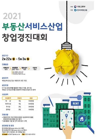 국토교통부는 부동산산업 분야 유망 새싹기업(스타트업) 발굴을 통한 창업생태계 조성과 청년 일자리 창출을 위하여 한국부동산원(원장김학규)과 '2021년 부동산서비스산업 창업경진대회’를 개최한다.