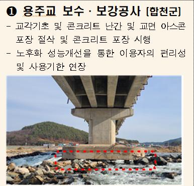 선정 시설은 조기 안전 확보를 위해 올해 공사 착수 및 준공이 가능한 사업 중심으로 선정되었으며, 준공이후 23년에서 49년까지 경과되어 시설물 안전등급이 D(미흡), E(불량) 등급인 노후 교량 및 저수지가 대부분이다.