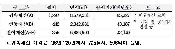 보훈처가 관리하는 친일귀속재산(토지)은 현재 855필지(면적 6,337천㎡ / 공시지가 421억원)지만, 대부분 임야이거나 도시계획시설, 문화재 보존지역 등이어서 매각에 어려움을 겪고 있다.