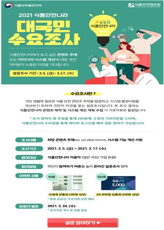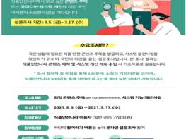 식품의약품안전처는 코로나19 이후 식품안전에 대한 관심이 높아짐에 따라 국민 생활 속 먹거리 안전정보를 제공하는 식품안전나라의 보다 편리한 이용을 돕기 위한 '2021년 식품안전나라 대국민 수요조사'를 3월 5일부터 17일까지 2주간 실시한다고 밝혔다.