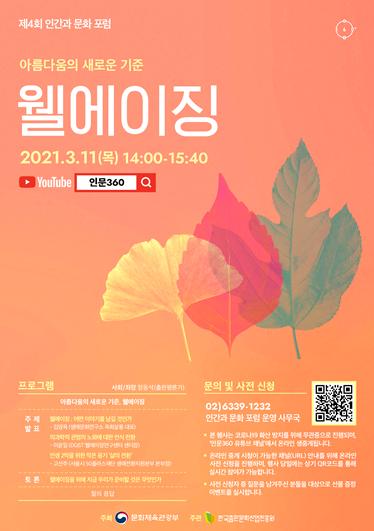 문화체육관광부는 한국출판문화산업진흥원과 함께 3월 11일(목) 오후 2시, ‘아름다움의 새로운 기준, 건강하게 나이 들기(웰에이징)’를 주제로 네 번째 ‘인간과 문화 포럼’을 개최한다.