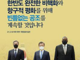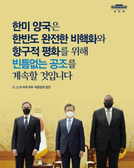 두 장관은 이번 방한이 바이든 대통령의 직접적인 결심에 따른 것이라고도 설명했다. 문 대통령은 양국의 시급한 과제인 한반도 비핵화와 항구적 평화 정착을 위해 한미 각급에서 수시로 협의와 소통이 이루어지고 있는 것을 평가하고, 한미가 함께 공동의 포괄적인 대북 전략을 마련해 나갈 필요가 있다는 점을 강조했다.