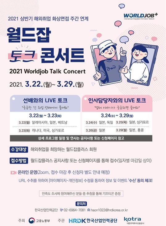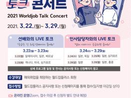 고용노동부가 주최하고 한국산업인력공단, 대한무역투자진흥공사가 공동 주관하는 ‘2021 월드잡 토크 콘서트’가 3월 22일부터 29일까지 온라인으로 개최된다.