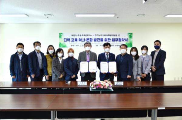 문화재청 국립나주문화재연구소(소장 이은석)는 3월 23일 오전 10시 국립나주문화재연구소 소회의실에서 전라남도나주교육지원청(교육장 김영길)과 함께 지역 교육·역사·문화 발전을 위한 업무협약을 체결하였다.