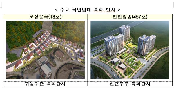 이번에 공급하는 국민임대 단지 중 보성운곡(18호), 상주공검(20호) 단지의 경우, 귀농귀촌을 희망하는 젊은 층과 인구유입을 희망하는 지역상황을 반영해 ‘귀농귀촌 주택’을 최초로 공급 할 계획이며, 인천영종(457호), 인천검단(750호) 등 ‘신혼부부 특화단지’에는 공동육아시설 등 육아 특화시설을 갖추고, 물량의 80%를 신혼부부에게 공급해 무주택 신혼부부들의 관심이 높을 것으로 전망된다.