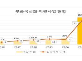 ‘부품국산화 지원사업’은 무기체계에 사용되는 핵심 부품 중 국외에서 수입하는 부품을 국내 제품으로 개발하는 사업이다. 올해는 방위산업 육성 및 발전에 관한 법률 시행에 따라 부품국산화 지원대상이 확대되었고 이에 따른 예산 (2020년 203억 원 -> 2021년 886억 원) 및 신규 지원 과제 수(2020년 11건 -> 2021년 51건 예상)가 대폭 증가하였다.