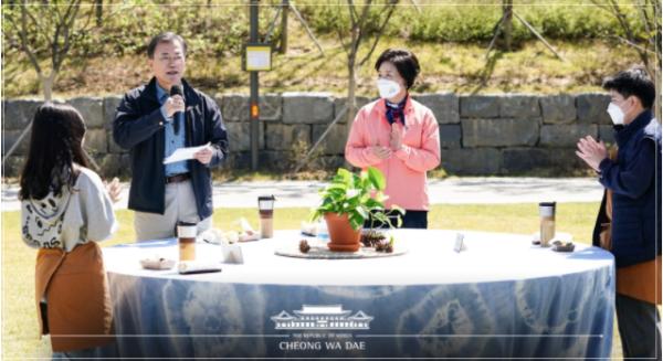 나무심기를 모두 마친 문 대통령 내외는 참석자들과 함께 야외에 마련된 간담회장으로 이동하여 이번 나무 심기에 참여한 숲사랑청소년단의 활동을 격려하고, 미래세대를 위한 탄소중립 실천의 중요성과 이를 실현하기 위해 올해 식목일을 계기로 범국민적 나무 심기 참여를 당부했다.