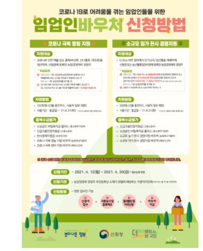 산림청은 코로나19 피해에 취약한 임가를 지원하기 위해 오는 4월 12일부터 바우처 지급대상자의 신청을 받는다.
