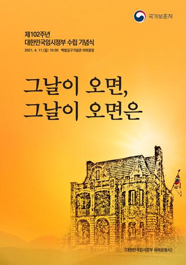 국가보훈처는 ‘제102주년 대한민국임시정부 수립 기념식’을 오늘 11일 오전 10시, 백범김구기념관 야외광장에서 열린다고 밝혔다.