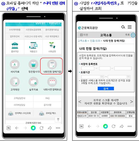 그간 사업주가 제출 서류의 처리상황을 조회하기 위해서는 컴퓨터(PC)로 고용산재보험 토탈서비스에 공인인증서로 접속하거나, 콜센터담당직원에게 진행 상황을 일일이 유선으로 확인해야 하는 불편함이 있었으나, 이제부터는 핸드폰을 이용하여 근로복지공단 모바일 홈페이지에서 애플리케이션 설치나 공인인증서 없이 간편하게 민원 처리 과정을 확인할 수 있게 되었다.