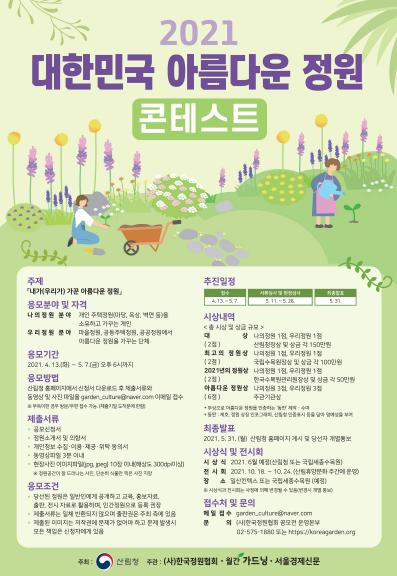산림청은 일상생활 속에서 정원의 아름다움을 향유하고 정원문화 확산을 위하여 「2021 대한민국 아름다운 정원 콘테스트」공모전을 오는 4월 13일부터 5월 7일까지 개최한다.