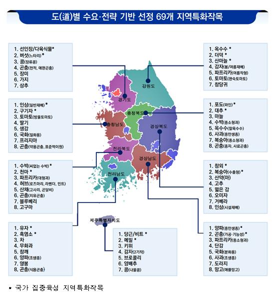 특히 69개 지역특화작목 중 △경기 선인장/다육식물·버섯(느타리) △강원 옥수수·산채(산마늘, 더덕) △충북 포도(와인)·대추 △충남 인삼·구기자 △경북 참외·복숭아 △경남 양파·곤충 △전북 수박(씨없는 수박)·천마 △전남 유자·흑염소 △제주 당근/비트·메밀 등 각 도별 2개씩 총 18개 작목을 국가 집중육성작목으로 지정하여 연구개발과 육성정책을 전폭적으로 지원한다.