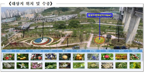 수목은 한국인들이 가장 선호하는 유실수(큰나무)를 조사하여 선정하였으며, 유실수에 대한 정보를 담은 안내판을 설치하여 교육체험용 장소로 활용할 수 있도록 하였다.