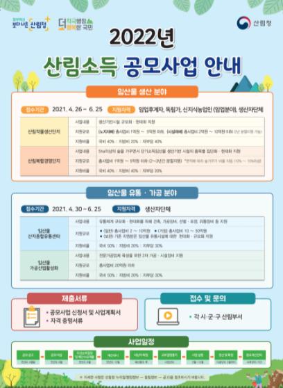 접수 기간은 임산물 생산 분야는 4월 26일부터, 임산물 유통·가공분야는 4월 30일부터 오는 6월 25일까지이다.