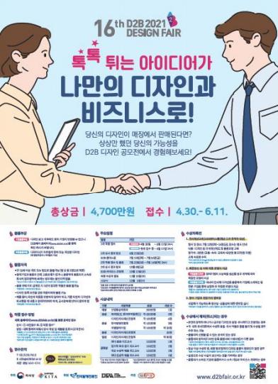 특허청과 한국무역협회는 디자인 비즈니스 전 과정을 경험하는 ‘2021 D2B(Design-to-Business) 디자인페어’ 공모전 작품을 4월 30일부터 6월 11일까지 온라인으로 접수한다고 밝혔다.