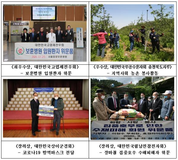 장려상은 국가유공자 및 취약계층에 코로나19 방역 마스크를 지원한 상이군경회와 장마철 집중호우로 어려움을 당한 수해 피해자를 지원하고 중앙보훈병원에 입원한 국가유공자를 위문한 월남전참전자회가 각각 선정됐다.